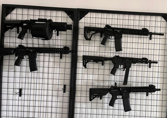 The image presents a collection of modern firearms mounted on a metal display grid. On the top left, a drum grenade launcher is visible, while the other sections feature rifles with different barrel lengths and accessory systems. Most of the rifles are equipped with modular rail systems and adjustable stocks. The organized setup gives the impression of a professional display for collection, exhibition, or military equipment demonstration purposes.