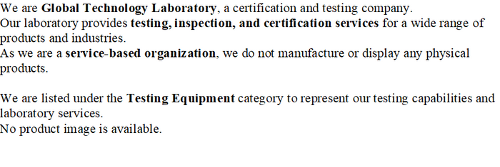 We provide testing and certification services for various industries, but we do not manufacture or display physical products.